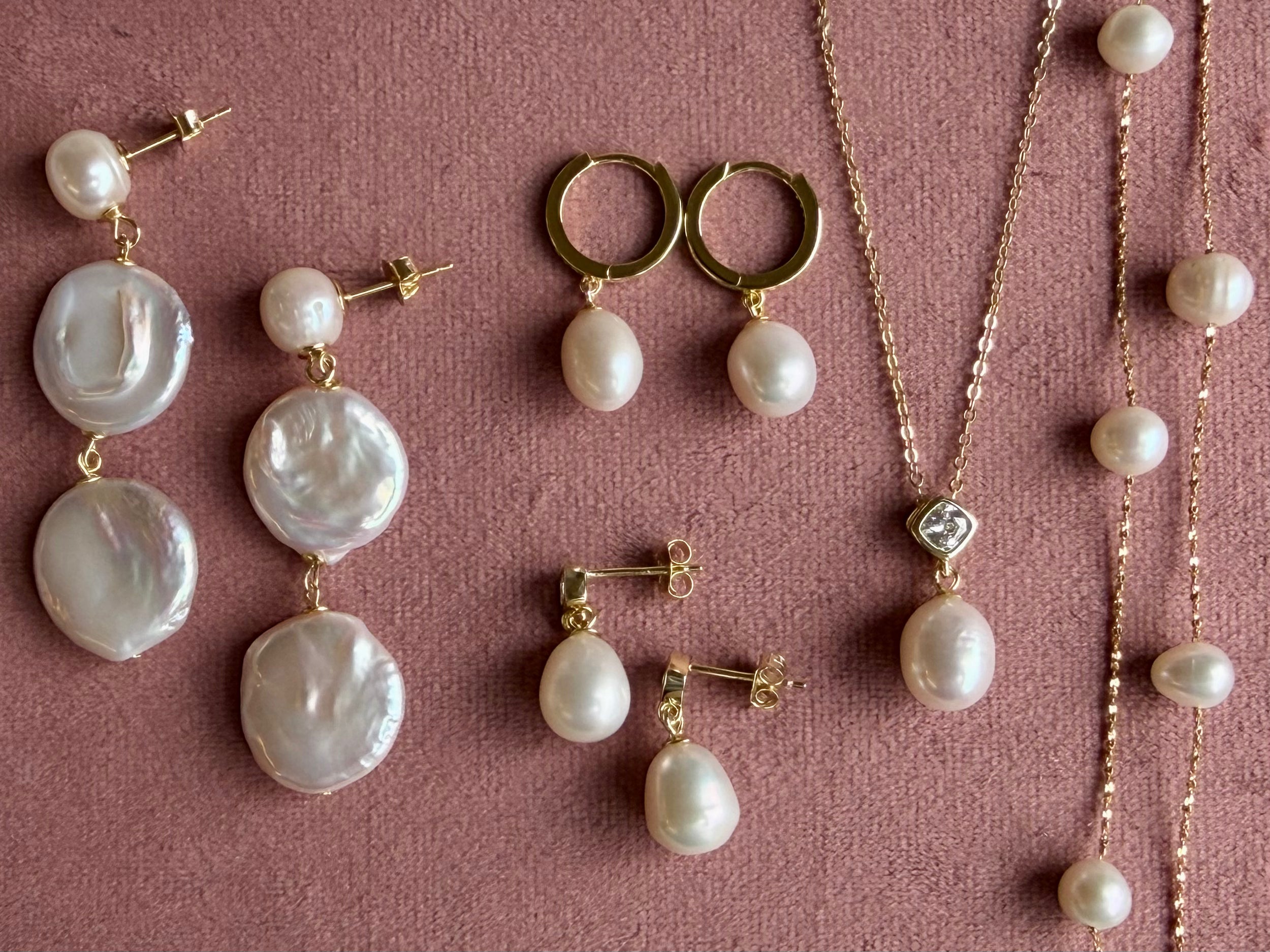 Our Pieces are Made with Hypoallergenic 18k Gold Plated 925 Sterling Silver, Genuine Pearls and Semi-precious Stones.